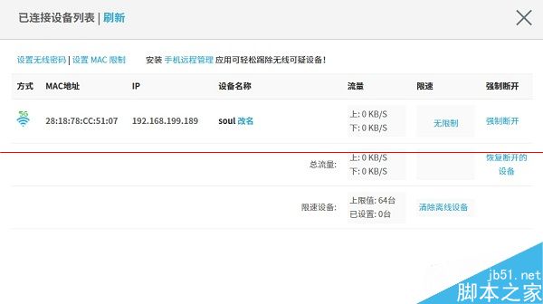 正中會顯示有幾臺設備正在連接路由器,點開會有詳情,能夠顯示接入當前無線網絡設備的MAC地址、IP地址和設備名稱等信息。給設備命名之后第二次連接時會自動識別,這樣哪些設備接入了極路由就一目了然了。