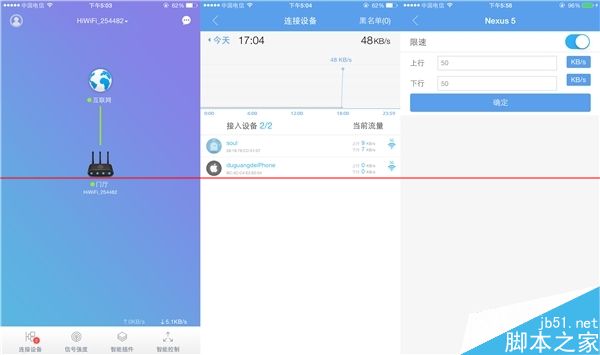 極路由后臺提供了對設備限速的功能,碰到喜歡無限制下載大容量文件的人可以對其限制速度,尤其是幾個人合租的情況下這項功能相當有用。之后我下載一款游戲來測試,一開始的速度在800K/S左右,啟動限速到50K/S,下載速度里面立馬下降到50K/S以下了,可以確定極路由3的限速功能是迅速且有效的。此外還提供了強制斷開功能,再也不怕陌生設備蹭網啦。