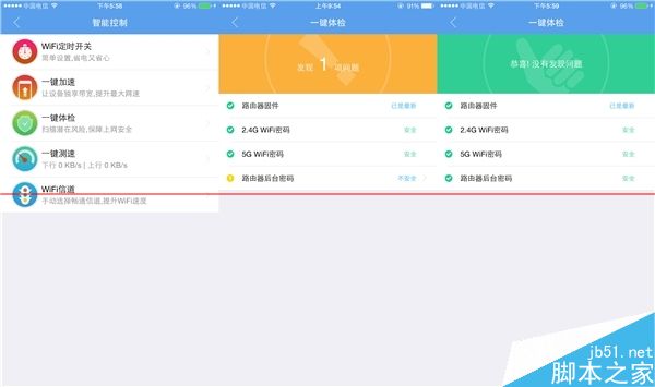測試一鍵體檢功能的時候發現,它會從路由器固件版本、2.4G/5G WiFi密碼和路由器后臺密碼來檢測風險水平,如果沒有修改后臺的默認登陸密碼的話就會被判定為不安全。對于一向不愛修改默認登陸密碼的國人來說是一個很好的提醒。