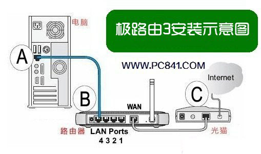 對于光線上網用戶或者不帶貓的用戶,直接將寬帶網線插入極路由3的WAN端口,LAN端口用于連接電腦。最后別忘了,極路由3也是要連接好電源適配器,并插好電源的。