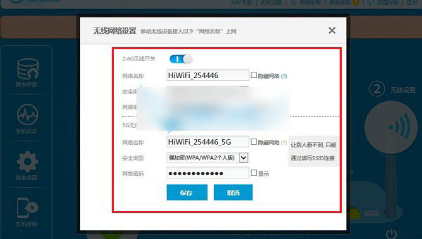 4、下一步設置之后,是WiFi無線設置,這里需要設置Wifi密碼,此外WiFI網絡名稱大家可以自由修改,至于安全類型,建議大家選擇WPA2,完成后點擊“保存”即可,如下圖所示。