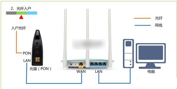 (2)、光釬上網:請準備2根網線,一根網線用來連接迅捷的WAN接口與光貓;另一根網線用來連接迅捷路由器上的任意一個LAN(1/2/3/4)接口與電腦上的網線接口。