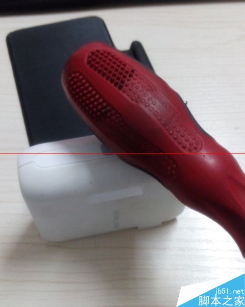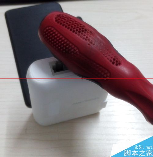 1、把迷你路由器豎立放好,用大號螺絲刀的橡膠柄敲擊路由器,力量要適度。