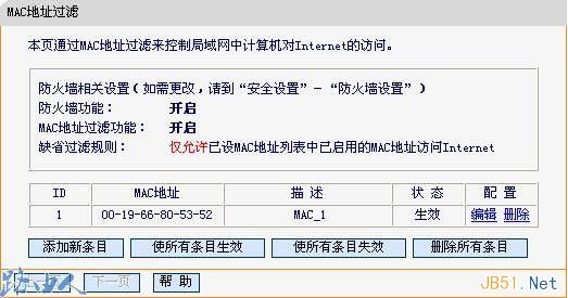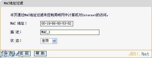 添加MAC地址:00-19-66-80-53-52,然后狀態選擇生效