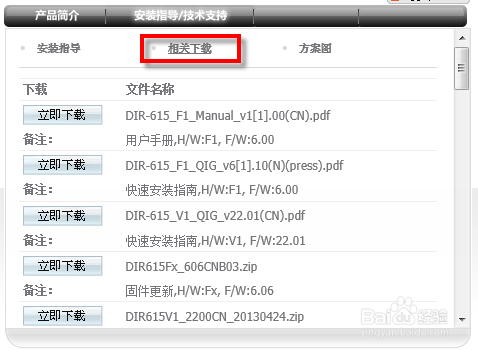 3、在中文網頁中找到搜索,然后在列表中找到DIR-615。然后在615的頁面右側選擇“相關下載”。