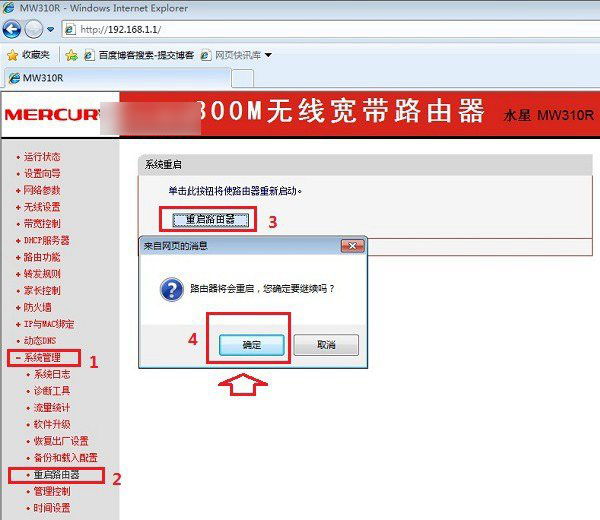 二、進(jìn)入水星路由器管理界面后,點(diǎn)擊左側(cè)的【系統(tǒng)管理】--【重啟路由器】,然后在右側(cè)的水星路由器重啟操作中,點(diǎn)擊【重啟路由器】,在彈出的確認(rèn)對(duì)話框中,點(diǎn)擊【確定】,如下圖所示。