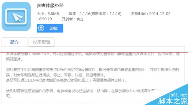 多媒體服務(wù)器(miniDLNA)插件,用于向內(nèi)部局域網(wǎng)共享USB拓展文件,對(duì)于支持UPnP協(xié)議的騰訊視頻、迅雷看看的播放器,它們可以直接播放存儲(chǔ)中的視頻文件。