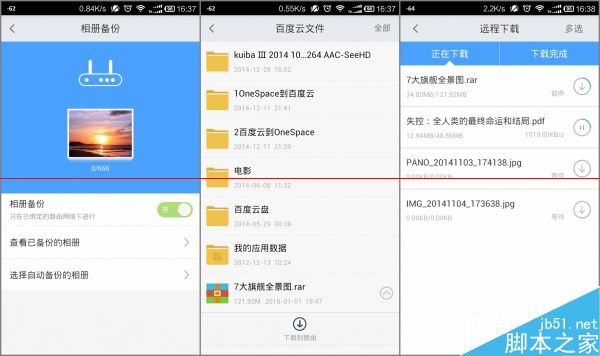 拓展頁還比網(wǎng)頁端多出了移動(dòng)端專屬的“相冊(cè)備份和百度云”插件,聯(lián)想和百度聯(lián)姻的優(yōu)勢(shì)就體現(xiàn)在這里了。前者可以將手機(jī)相冊(cè)自動(dòng)備份到外接的USB設(shè)備上(左一),后者則可以離線下載綁定的百度云文件(右兩圖)。