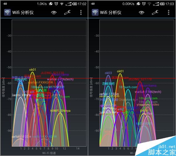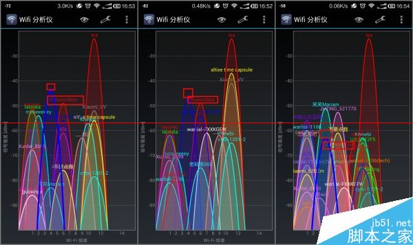 上面分別是距離兩個(gè)路由0m、5m(有非承重墻阻隔)和10m距離的測(cè)試結(jié)果。左側(cè)紅框是newifi mini 的信號(hào),右側(cè)紅框是對(duì)比參照磊科Q3的信號(hào)。右側(cè)像bug一樣飆高的紅色峰值是因?yàn)闇y(cè)試機(jī)連上了它的wifi,直接導(dǎo)致相同信道的wifi信號(hào)讀數(shù)偏高。