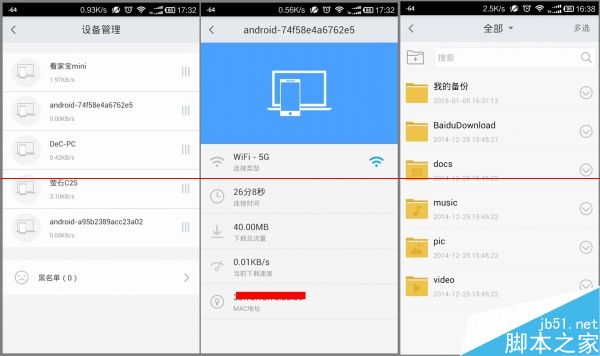 設(shè)備管理還是查看設(shè)備列表和網(wǎng)絡(luò)使用詳情(左側(cè)兩圖),文件管理中可以直接讀取路由上的USB存儲(chǔ)設(shè)備文件(右一),甚至用起來比PC端的還要方便不少。