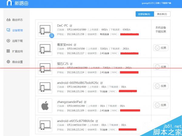 設(shè)備管理頁面可以看到每臺(tái)接入設(shè)備的IP、MAC地址、實(shí)時(shí)速度和鏈接時(shí)間,并且提供了設(shè)備名稱標(biāo)注和拉黑功能,但暫時(shí)無法進(jìn)行詳細(xì)的上下行速度限制。