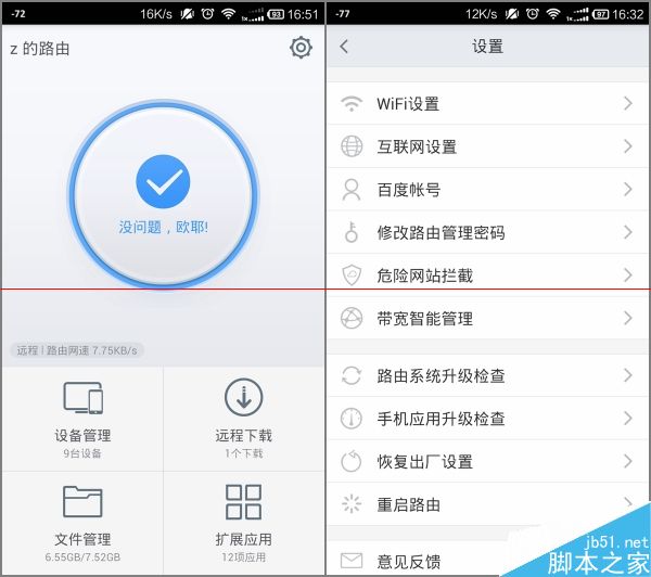 客戶端造型很簡(jiǎn)潔,設(shè)備管理、遠(yuǎn)程下載、文件和管理管理,設(shè)置界面中則一次過放下了路由的wifi、帶寬管理等功能。