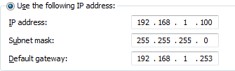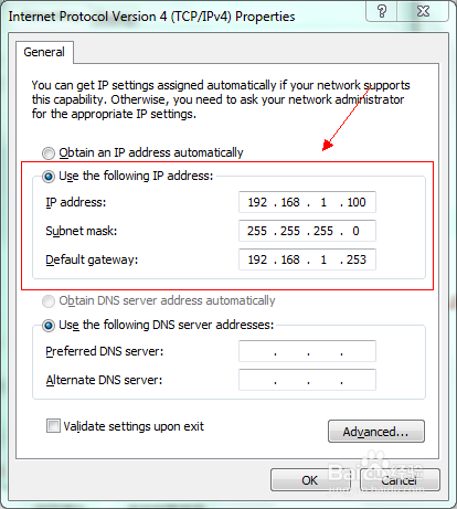 4、如上圖,IP address填寫192.168.1.X(1≤X≤252),這里我們用的100。Subnet mask(子網掩碼)填255.255.255.0,Default gateway(默認網關)填寫192.168.1.253,即路由的管理頁面地址。