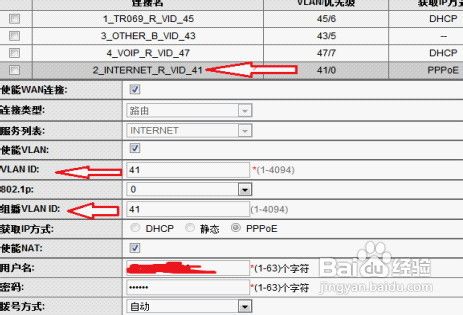 的一項,記錄下參數或干脆截屏(特別是LAN ID參數與組播VLAN ID參數 )>>> 然后刪除帶有INTERNET的項,再新建一個項 >>> 參數設置如下 連接類型選擇路由;服務列表選INTERNET ;把剛記下的VLAN ID和組播VLAN ID填上(每個地區的都不一樣,必須填上你剛記下的);獲取IP方式改為PPPoE;使能NAT打鉤;填寫上網的用戶名與密碼;撥號方式自動 如下圖為更改后的設置。
