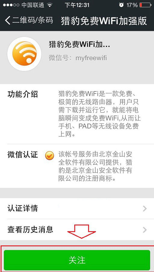 三、接下會提示需要關注獵豹移動微信,我們選擇關注即可,如下圖: