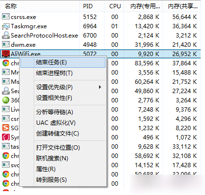 三、進入電腦任務管理器,然后找到“AliWiFi.exe”進程,右鍵選擇結束該進程,如下圖所示: