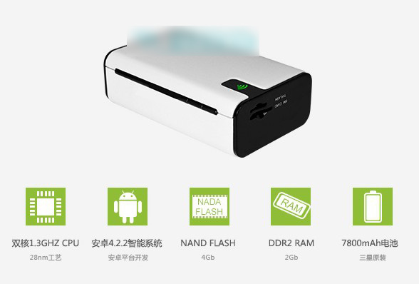 “隨身寶”搭載了雙核1.3GHz CPU ,使用了28nm工藝,結合低功耗wifi技術,內置DDR2 2G的RAM和4G NAND FLASH空間。采用7800mAh電池和主流的安卓4.2.2智能系統,一次充滿電可用三天。在保證隨身寶本身上網的同時,還可以給手機平板電腦充電。針對流量管理,隨身寶設計了流量提醒、流量限制、一鍵鎖網的三重功能,讓你免受3G超流量后的天價流量費的擔憂。
