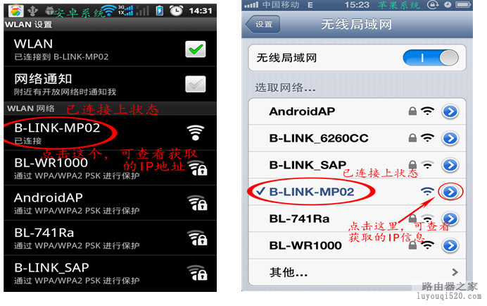 ②、找到要連接的SSID(比如本例當(dāng)中的B-LINK-MP02),并連接它。如下圖: