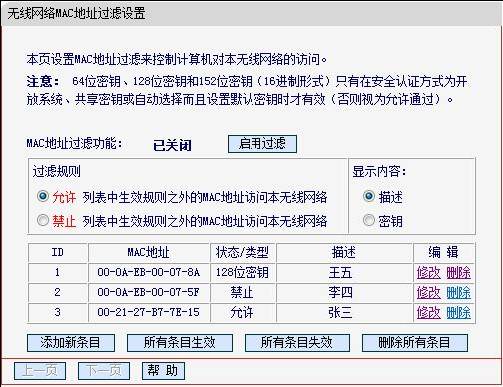 條目添加完成后,啟用MAC地址過濾功能。此時,無線MAC地址過濾設(shè)置中條目如下圖: