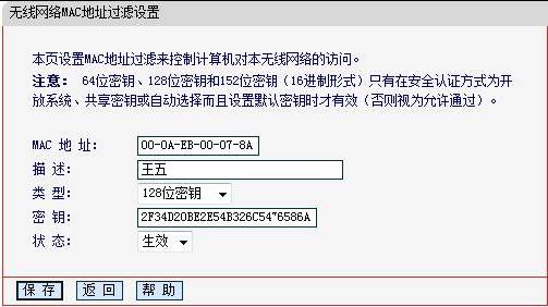 點擊“添加新條目”按鈕,添加MAC地址為“00-0A-EB-00-07-8A”,類型為“128位密鑰”,密鑰為” 2F34D20BE2E54B326C5476586A”,狀態(tài)為“生效”的條目。為了方便管理,描述一項中可以添加說明。譬如該地址為王五的電腦,則可以在描述中填寫“王五”。