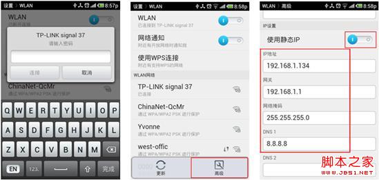 l 輸入設置好的無線密碼即可連接成功。如果無線連接成功但是上不了網,您可以參考下圖嘗試將手機的IP地址手動指定。