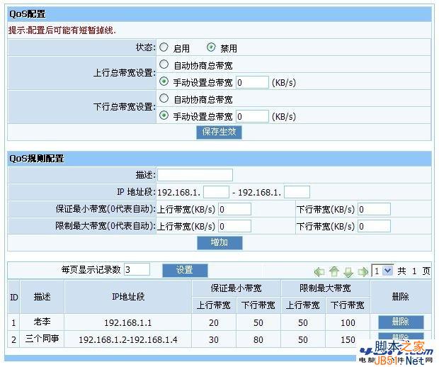 705S路由器還有一個非常實用的功能:QoS限速。限制網速是一件很有意義也很有意思的事情,舉個例子說,假如你想要玩玩游戲或者瀏覽網頁看看新聞什么的,但是這時跟你同用一臺路由器的朋友在一邊開著電影或者下BT之類的,那肯定您會很煩,糾結啊,郁悶啊,怎么辦呢?進入到路由器設置界面,點擊“QoS設置”,如下圖所示,你可以隨意設置共用這臺路由器的每個用戶的網速。控制別人占用的帶寬范圍,保證自己的網速,我的網絡我做主,我是主人,網速分配自己說了算。