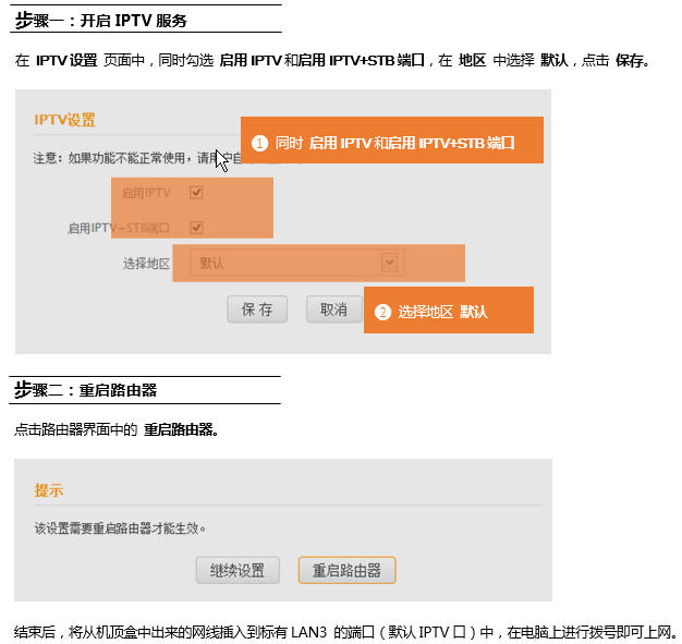 重啟路由器后,將從機(jī)頂盒中出來(lái)的網(wǎng)線口插入到標(biāo)有 LAN3 的端口(默認(rèn)IPTV口)中,在電腦上進(jìn)行撥號(hào)即可成功。