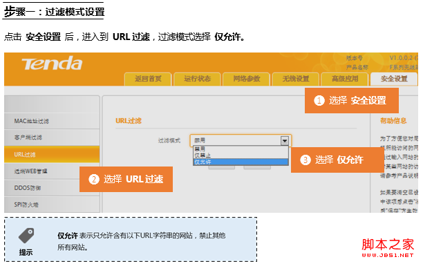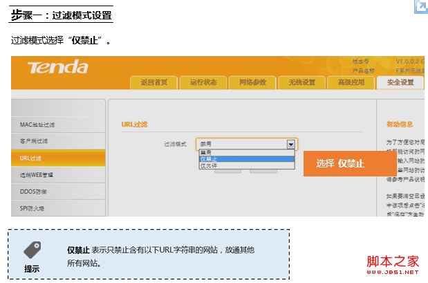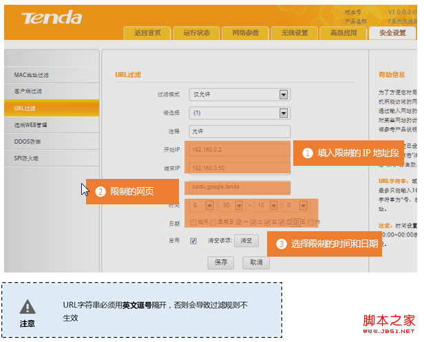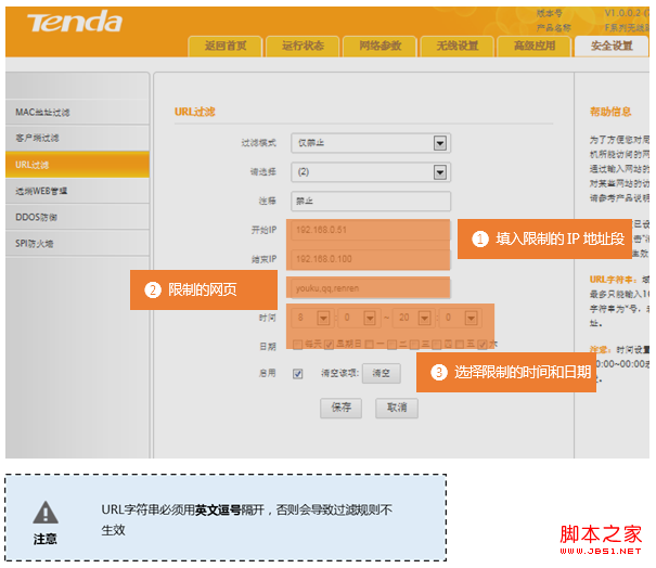 在登錄到路由器管理界面后,在安全設置 的 URL過濾 界面中來實現限制一的條件: