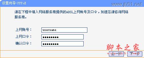 步驟5:輸入寬帶“上網賬號”及“上網口令”,擊“下一步”,如下圖所示。