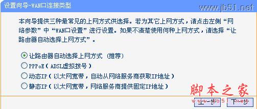 步驟4::根據前端寬帶線路來決定選擇上網的方式,若不清楚可選擇推薦項。此例以PPPOE為例。