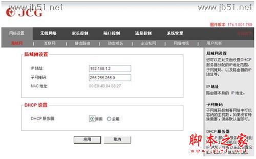 最后,網絡設置—局域網—局域網設置(IP地址選擇與主路由器在同一網段, IP地址可以不同;如:主路由的IP地址為192.168.1.1,那么次路由的IP地址應該為192.168.1.(2—255))--DHCP設置—選擇“禁用”,然后點擊“應用”如下圖: