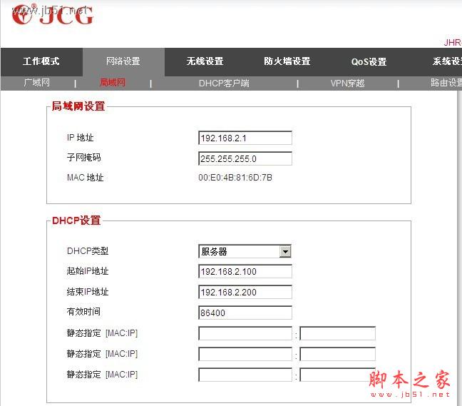 網絡設置——局域網(“IP地址”這里要設置成和第一臺路由器不一樣的網段。如:第一臺路由器局域網的IP地址為192.168.1.1。那么第二臺路由器的IP地址應改成192.168.2.1)