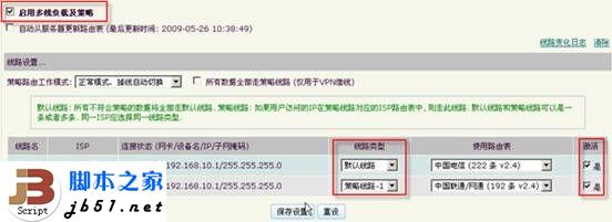 九、在線路設置中可以看到剛才設置的廣域網[WAN-1]和廣域網[WAN-2]的摘要信息,在線路類型欄中分別選擇不同的線路類型,如:WAN1選擇默認線路,WAN2選擇策略線路-1,并勾選激活選項,點擊保存設置即可。