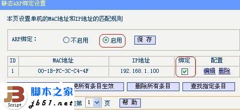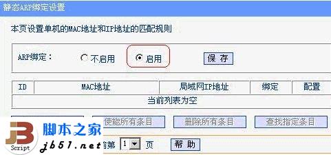 二、打開靜態ARP綁定設置窗口如下,默認情況下ARP綁定功能是關閉,請選中啟用后,點擊保存來啟用。
