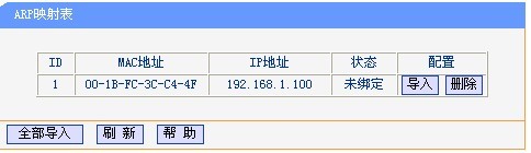 2、通過ARP映射表,導入條目,進行綁定,打開ARP映射表窗口如下,這是路由器動態學習到的ARP表,可以看到狀態這一欄顯示為未綁定,如果確認這一個動態學習的表正確無誤,也就是說當時網絡中不存在ARP欺騙,把條目導入,并且保存為靜態表。