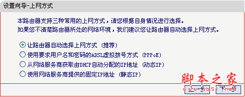 單擊“下一步,進入上網方式選擇頁面。頁面顯示了最常用的三種上網方式,您可以根據自身情況進行選擇,然后單擊“下一步。