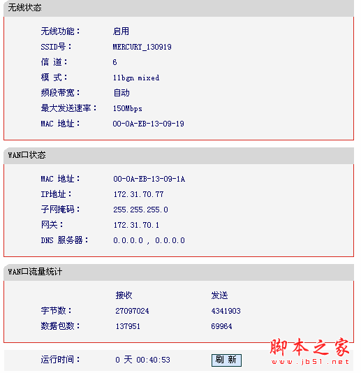 查看WAN口狀態,如果IP地址顯示為“0.0.0.0”說明我們的路由器已經連接互聯網,WAN口流量顯示當前路由器接收、發送的數據包數量。到這里我們的路由器設置就完成了。
