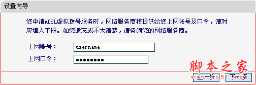 這里示例中演示的是一般家庭寬帶用戶所采用的PPPoE的上網方式,點擊“下一步后出現如下畫面。填寫ISP給我們提供的寬帶用戶名和密碼。