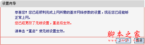 單擊“下一步后,會出現設置向導完成界面。點擊“重啟后即可完成路由器設置。