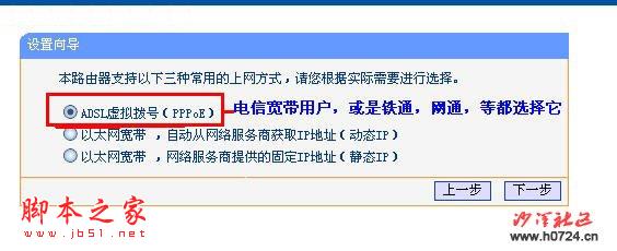 這里選擇adsl虛擬撥號(hào),我們大多都是選擇它的,其他的靜態(tài)那是專(zhuān)線(xiàn)用戶(hù)選擇的,我們這里不做詳細(xì)介紹,知道寬帶用戶(hù),鐵通,網(wǎng)通等虛擬撥號(hào)用戶(hù),選擇它就行了,然后下一步請(qǐng)看圖片