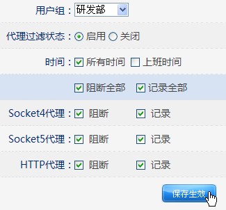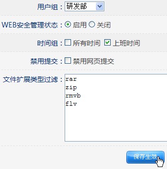 首先選擇你想要控制的用戶組(之前配置過),再選擇生效時間,在選擇是否啟用禁用提交,和文件擴展類型過濾,最后保存生效。