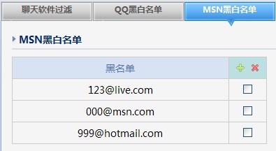 MSN黑白名單可以通過具體的MSN郵箱賬號來實現過濾和允許。配置方法于QQ黑白名單相同。