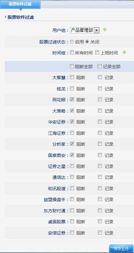 支持主流股票軟件基于用戶組、時間段的過濾,您可以設置不同用戶組的不同權限。實現此項功能,必須啟用股票過濾狀態。