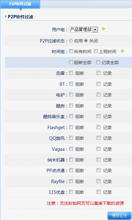 支持主流P2P軟件基于用戶組、時間段的過濾,您可以設置不同用戶組的不同權限。實現此項功能,必須啟用P2P過濾狀態。