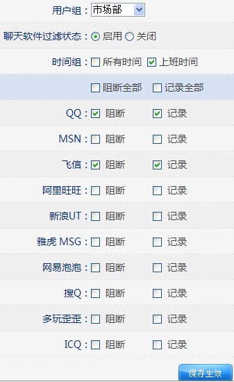 支持主流聊天軟件基于用戶組、時間段的過濾,您可以設置不同用戶組的不同權限,比如A組阻斷QQ,B組阻斷飛信,而C組全部記錄。