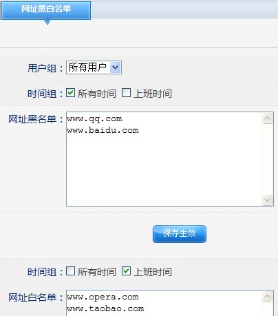 首先選擇你想要控制的用戶組(之前配置過),再選擇生效時間,之后再網址黑白名單里輸入您想要阻止和允許的網址。最后保存生效。