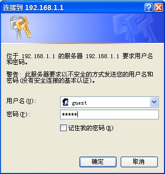 2:在彈出窗口輸入用戶名:guest 密碼:guest(注意都為小寫。如果你需要經常配置路由器,可以勾選記住我的密碼),按下確認鍵