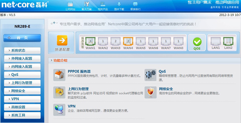 針對中小企業、辦公室或出租屋,推薦磊科RC平臺系列路由器:NR235W, NR236W, NR255-V, NR256, NR266, NR266-E, NR268, NR286, NR286-E, NR288, NR289-E。 現以磊科NETCORE NR289-E為例,進行如下配置:第一步,登陸路由器設置界面;第二步:設置上網行為管理;第三步:上網行為管理日志服務。