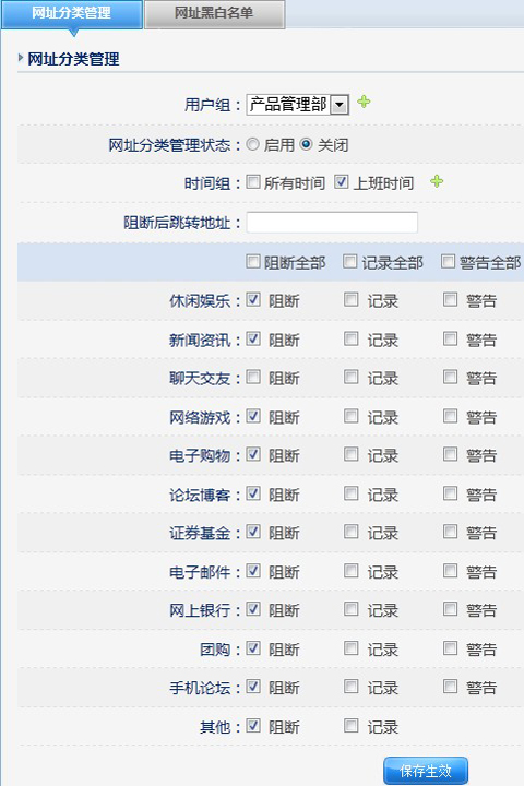 首先選擇你想要控制的用戶組(之前配置過),然后勾選啟用網址分類管理狀態,再選擇生效時間,之后選擇你想要阻斷或控制或警告的網址分類;您可以設置不同用戶組的不同權限,比如A組 阻斷論壇博客,B組阻斷電子購物,C組警告聊天交友,所有用戶記錄網絡游戲網站等。