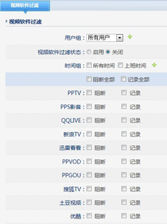 支持主流視頻軟件以及視頻網站的基于用戶組、時間段的過濾,您可以設置不同用戶組的不同權限。實現此項功能,必須啟用視頻軟件過濾狀態。